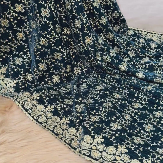 Wrap yourself in timeless elegance with our Emerald Green Embroidered Velvet Shawl, a masterpiece from Naseem Textile’s Luxe Winter Collection. Crafted on rich velvet, this shawl features intricate sequin+gold zari embroidery that adds a regal charm to your festive and wedding wardrobe.