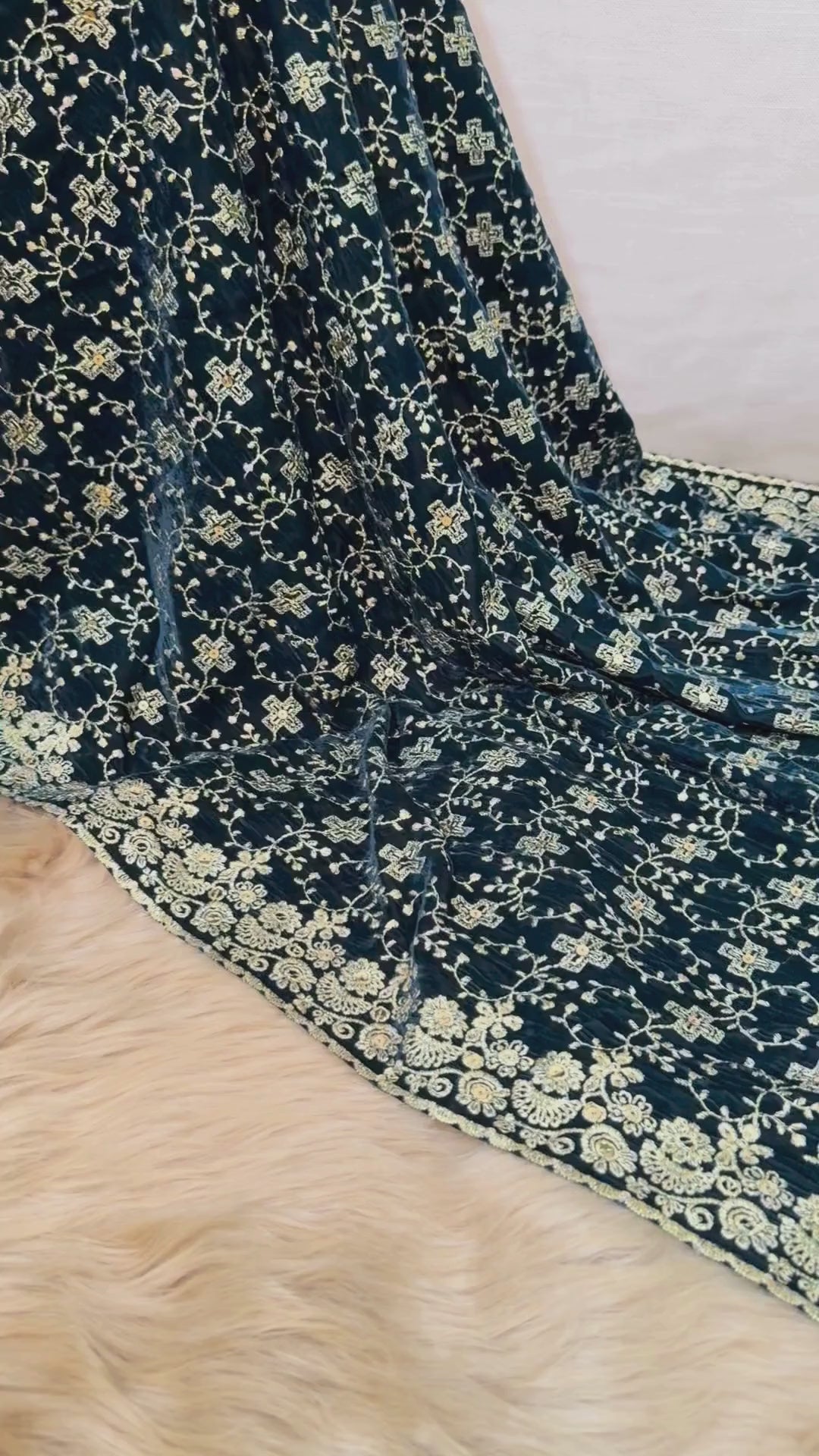 The heavy embroidered border and delicate all-over motifs radiate sophistication, making it a perfect choice for formal events, wedding dinners, and winter soirées. Soft to touch and gracefully draping, it embodies luxury and warmth in every thread.