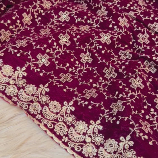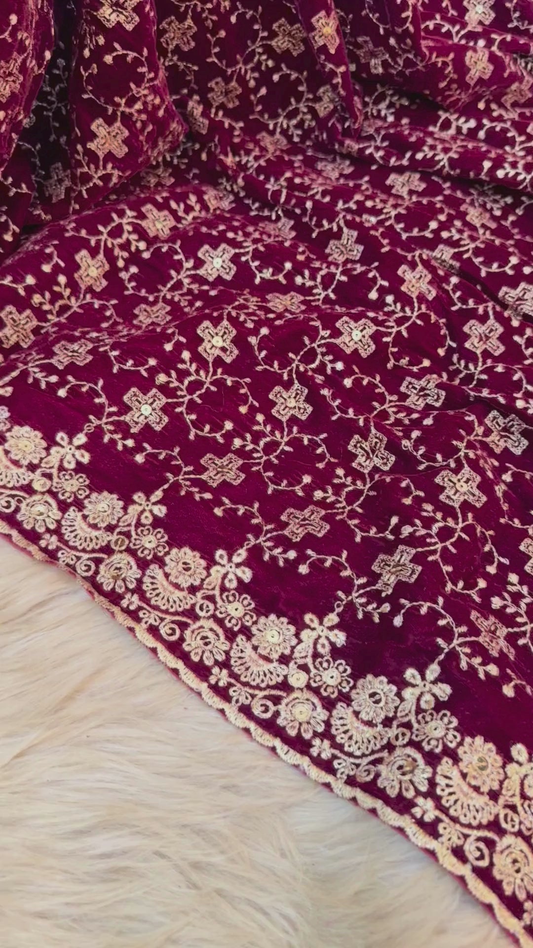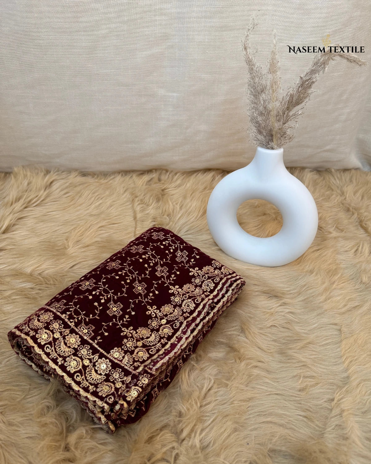 Wrap yourself in timeless elegance with our Maroon Embroidered Velvet Shawl, a masterpiece from Naseem Textile’s Luxe Winter Collection. Crafted on rich velvet, this shawl features intricate Sequin+gold zari embroidery that adds a regal charm to your festive and wedding wardrobe.
